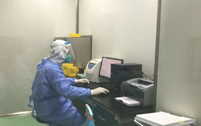 李润青在清华长庚—燕达医院PCR实验室进行首批实验的场景