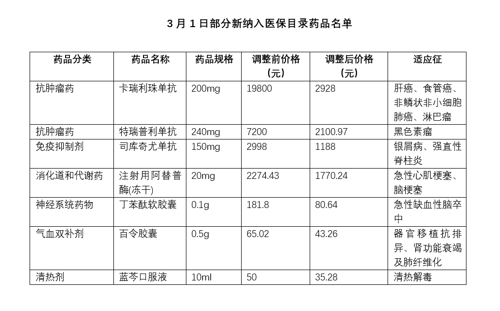 本次医保目录调整,不少新上市的好药名列其中。以备受关注的抗肿瘤药PD-1抑制剂为例,我国首款国产PD-1单抗药物,用于治疗黑色素瘤的特瑞普利单抗,价格从7200元/240mg降至2100元/240mg;适应症为肝癌、食管癌、非鳞状非小细胞肺癌、淋巴瘤的卡瑞利珠单抗,单支价格从19800元/200mg降至2928元/200mg;治疗复发或难治性经典型霍奇金淋巴瘤和局部晚期或转移性尿路上皮癌的替雷利珠单抗,价格从10688元/100mg降至2180元/100mg。进入医保后,患者的疾病负担将进一步减轻。