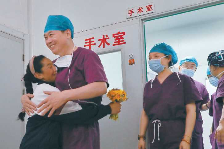 7月8日下午,青海省果洛藏族自治州人民医院手术室外,小姑娘旦正措攥着一把在草原上采的野花,翘首等待着。门终于打开了,当天已做了14台手术的清华长庚医院院长董家鸿院士走了出来,旦正措赶紧上前,与朝思暮想的董爷爷紧紧拥抱在一起。