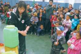 志愿者赵漪诺为道扎福利学校的孩子们演示如何正确洗手。