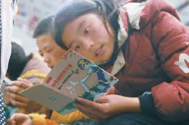 果洛州道扎福利学校里,孩子们认真阅读“同心·共铸中国心”组委会准备的《包虫病科普手册》。