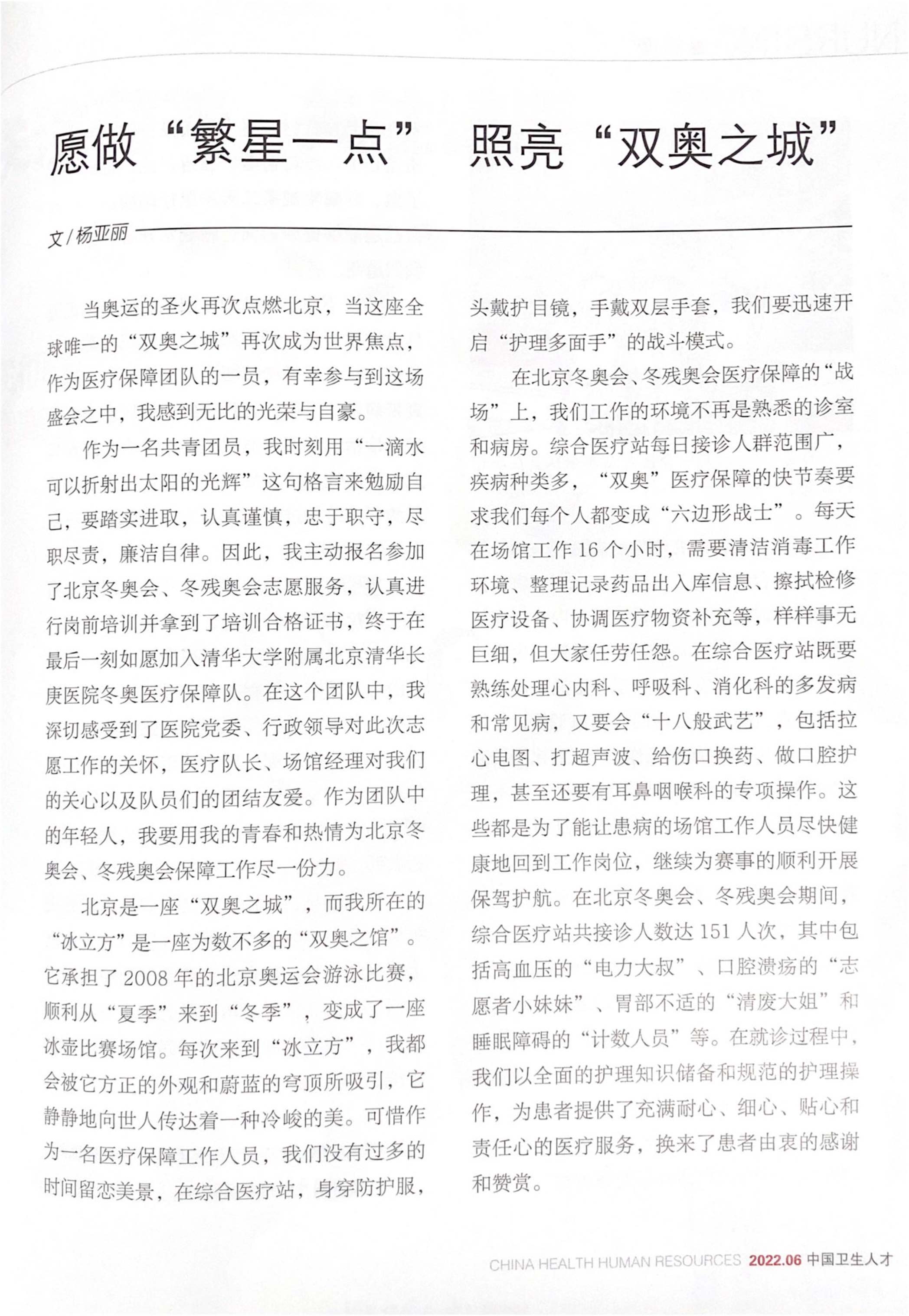 中国卫生人才杂志刊登我院冬奥保障文章:愿做“繁星一点”照亮“双奥之城”