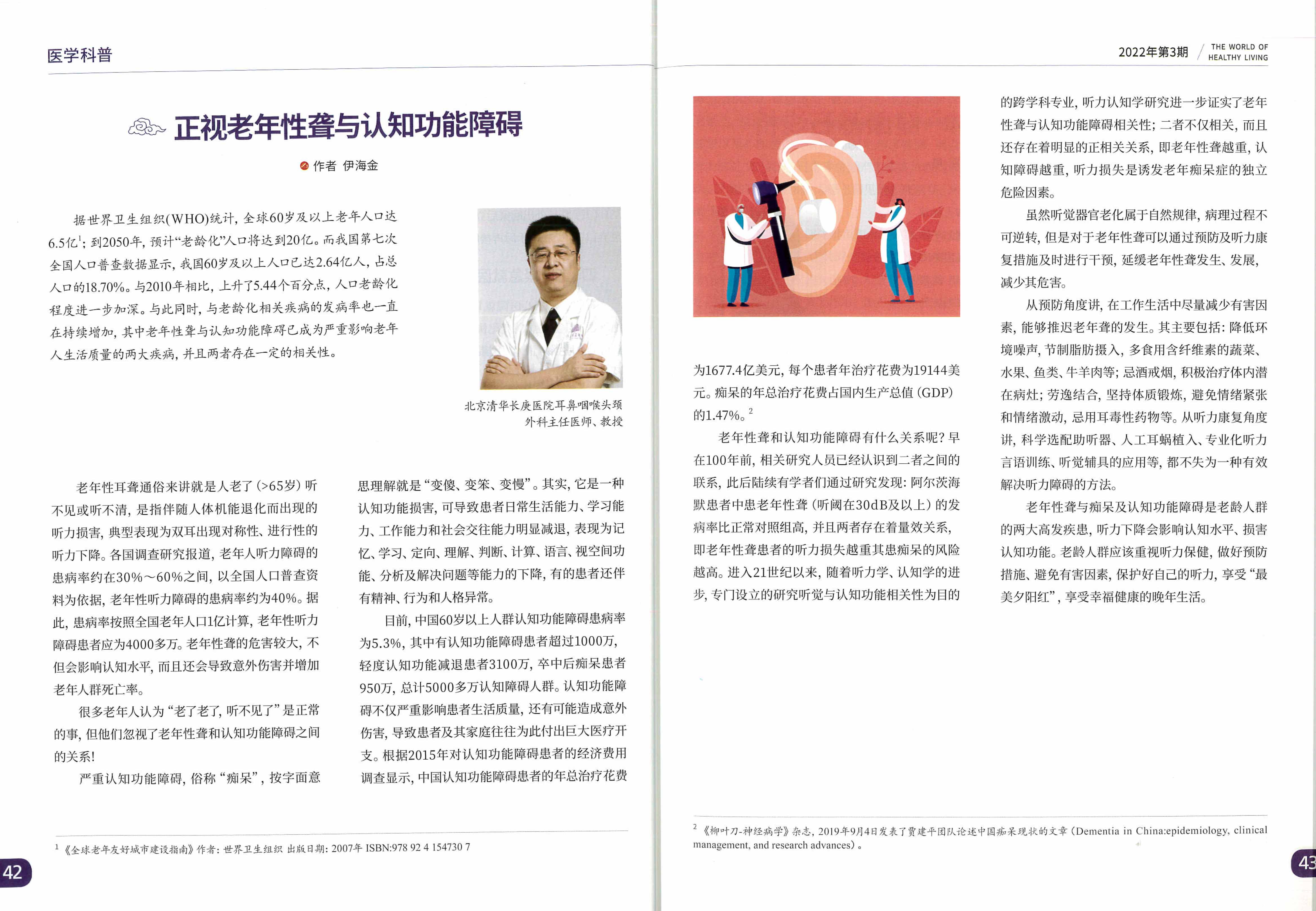 据WHO 统计,目前世界上老龄人口,即60 岁及以上的人口达6 .5 亿;到2050 年,预计“老龄化”人口将达到20 亿。而在我国,2010 年第六次全国人口普查显示,60 岁以上的老人已达到近1.78亿,占我国总人口的13 .26% 。与此同时,与老龄化相关疾病的发病率也一直在持续增加,其中老年性聋与认知功能障碍已成为老年人口中发病率高、严重影响老年人生活质量的两大疾病,并且两者存在一定的相关性。