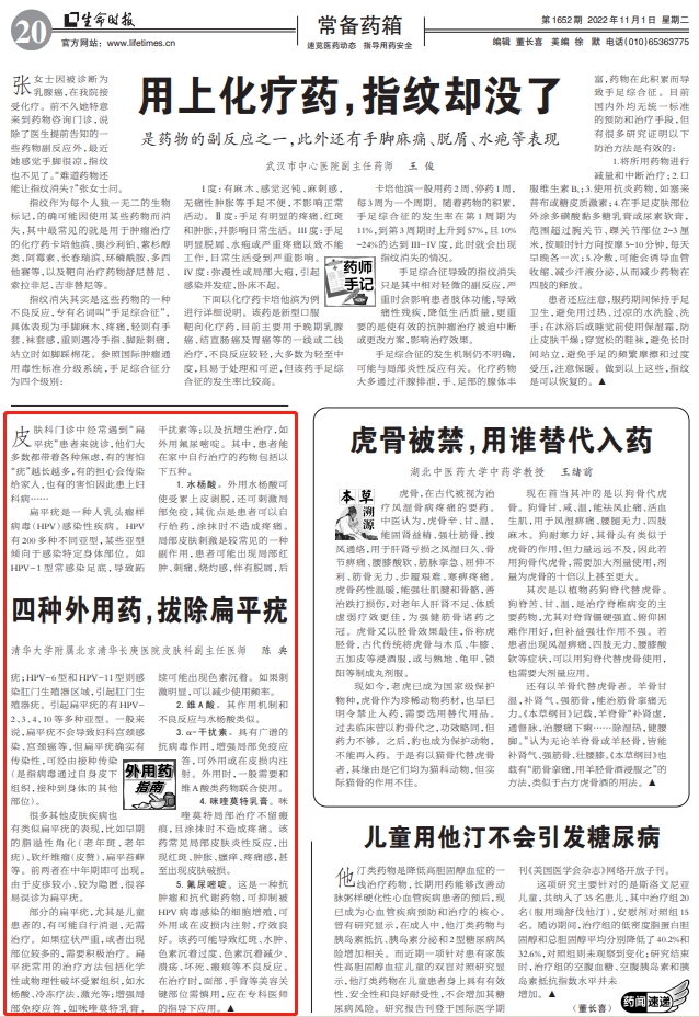1.水杨酸。外用水杨酸可使受累上皮剥脱,还可刺激局部免疫,其优点是患者可以自行给药,涂抹时不造成疼痛。局部皮肤刺激是较常见的一种副作用,患者可能出现局部红肿、刺痛、烧灼感,伴有脱屑,后续可能出现色素沉着。如果刺激明显,可以减少使用频率。