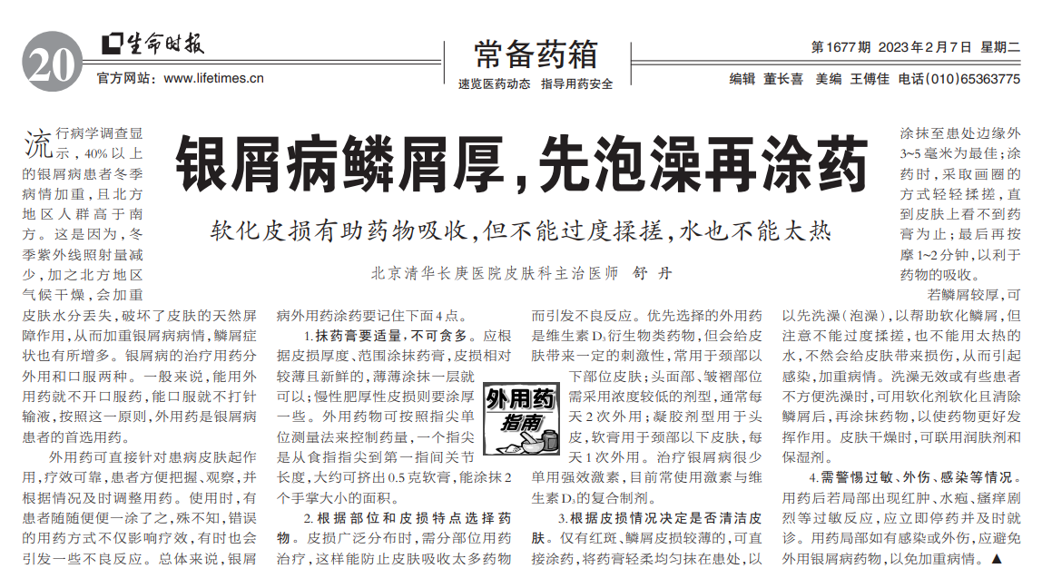 4.需警惕过敏、外伤、感染等情况。用药后若局部出现红肿、水疱、瘙痒剧烈等过敏反应,应立即停药并及时就诊。用药局部如有感染或外伤,应避免外用银屑病药物,以免加重病情。▲