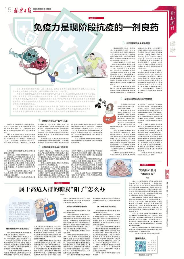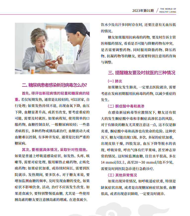 第三,糖尿病患者常有合并症,增加了感染新冠后的高危系数。糖尿病并不是简单的血糖升高,实际上,只有10%的糖尿病仅有单纯血糖升高,很多患者同时伴有肥、高血压、心脑血管疾病、睡眠呼吸暂停等多种问题。一些糖尿病患者还有其他的并发症,如糖尿病肾病,肾功能不全等。这些情况会削弱人体的抵抗力,导致易感新冠病毒,同时感染后容易加重原有的合并疾病的病情。据有关研究表明,高龄和糖尿病是导致新冠病毒感染发生重症和死亡的高危因素。因此,糖尿病患者感染新冠病毒,被判定为高危人群,需要临床着重关照,这让很多糖友倍感忧心。THEWORLDOFHEALTHYLIVING212023年第01期二、