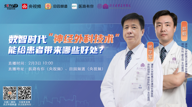 脑胶质瘤被称为“大脑杀手”,是最常见的原发性颅内肿瘤,也是神经外科治疗中最棘手的难治性肿瘤之一。目前,数智神经外科技术能为患者提供哪些更好的医疗服务?2月3日10:00,清华大学附属北京清华长庚医院外科部部长、神经外科主任、主任医师杨学军,神经外科副主任、主任医师郭毅将做客央视频直播间,和大家分享数智时代脑疾病的外科诊疗。