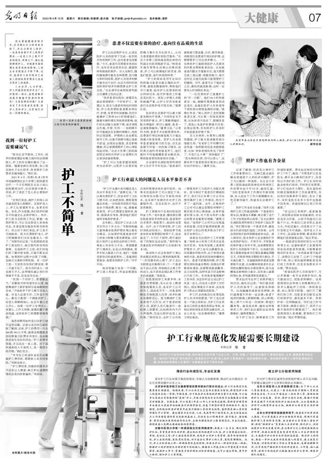 护工以生活照护为主,以及在医护人员的指导下完成一些非技术性的照护工作,这对患者也很重要。“今天,患者不仅需要有效的治疗,也向往有品质的生活,渴望陪伴和细致的照护。当人生病后,随时随地都可能有各种需要,因为精力和时间有限,医护人员很多时候只能专注于治疗,生活方面时时刻刻的照护很多时候需要由护工来完成。”北京清华长庚医院骨科副主任潘勇卫告诉记者。