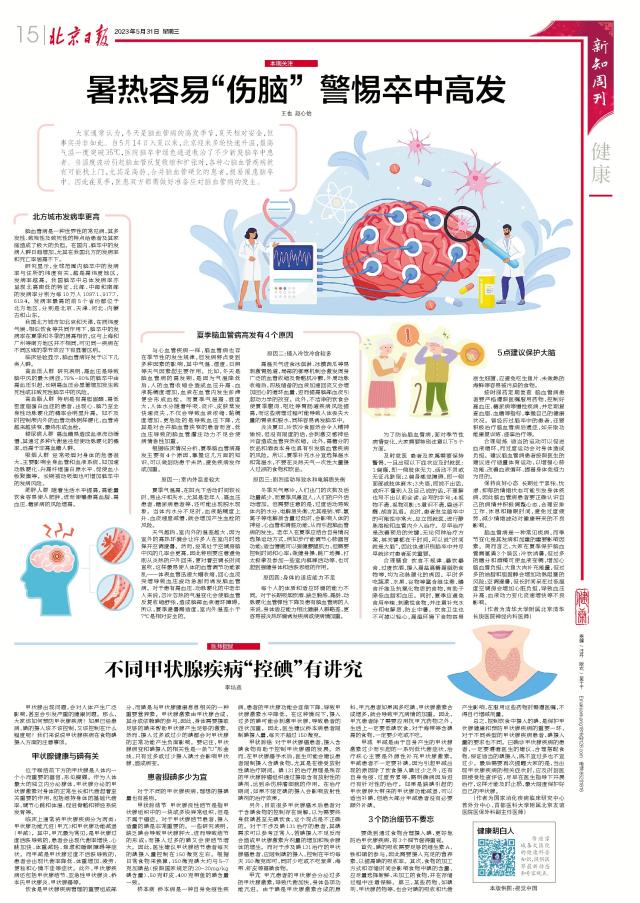 大家通常认为,冬天是脑血管病的高发季节,夏天相对安全,但事实并非如此。自5月14日入夏以来,北京迎来多轮快速升温,最高气温一度突破35℃,医院脑卒中绿色通道收治了不少新发脑卒中患者。当温度波动引起脑血管反复收缩和扩张时,各种心脑血管疾病就有可能找上门,尤其是高龄、合并脑血管硬化的患者,极易罹患脑卒中。因此在夏季,医患双方都需做好准备应对脑血管病的发生。
