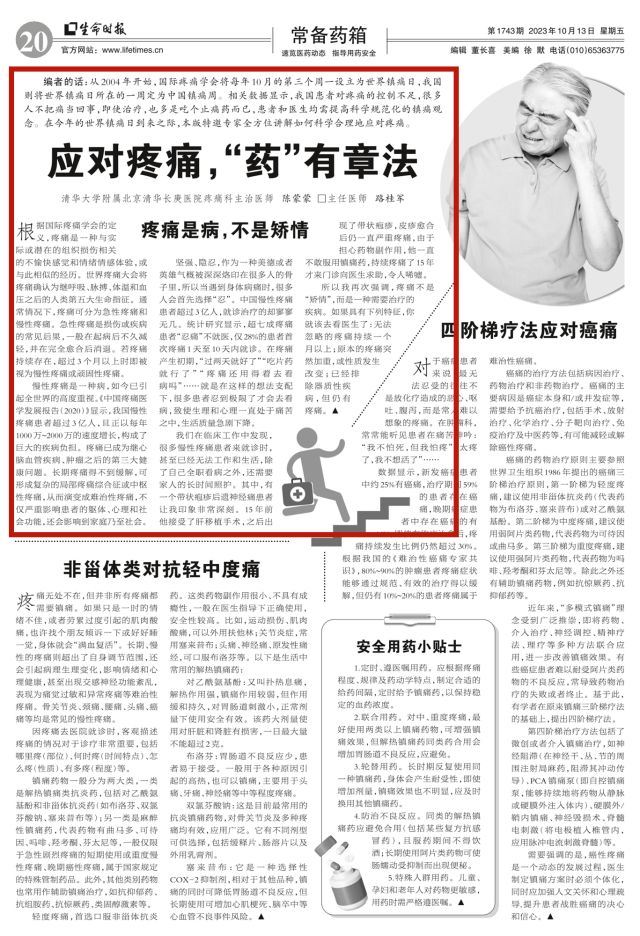 编者的话:从2004年开始,国际疼痛学会将每年10月的第三个周一设立为世界镇痛日,我国则将世界镇痛日所在的一周定为中国镇痛周。相关数据显示,我国患者对疼痛的控制不足,很多人不把痛当回事,即使治疗,也多是吃个止痛药而已,患者和医生均需提高科学规范化的镇痛观念。在今年的世界镇痛日到来之际,本版特邀专家全方位讲解如何科学合理地应对疼痛。