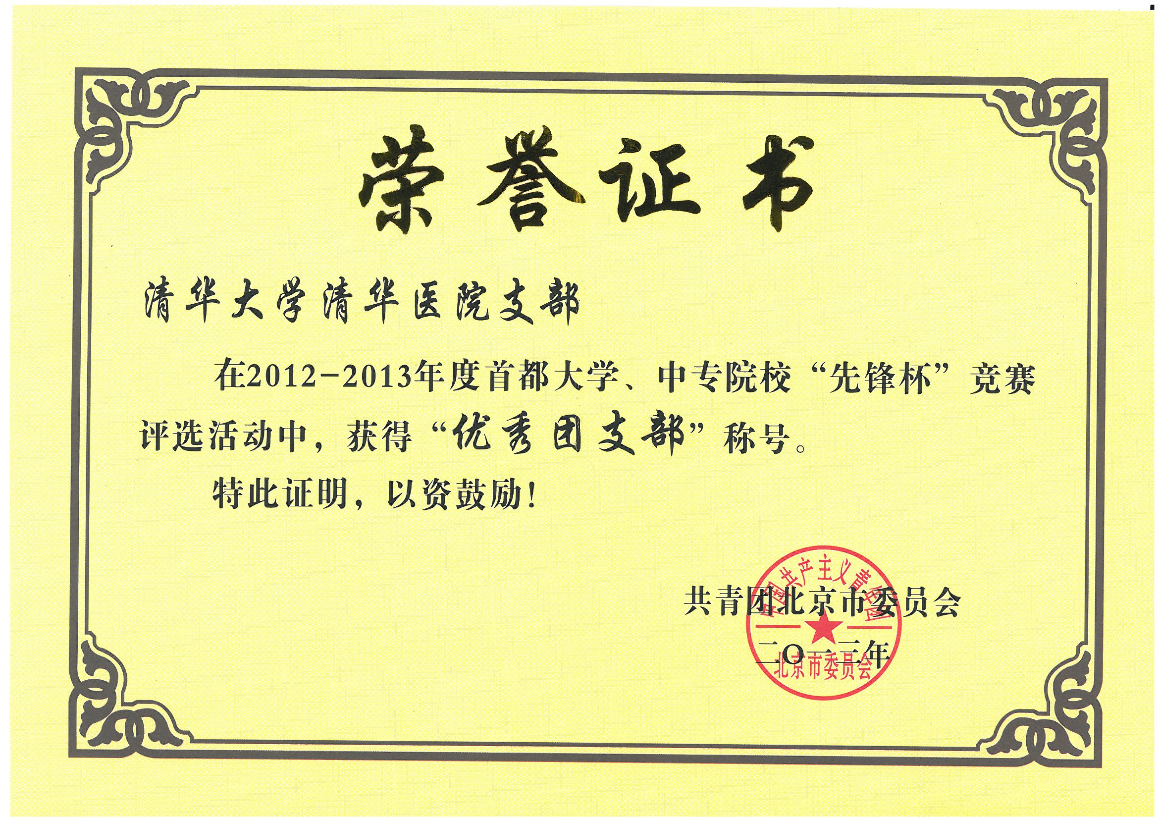 (通讯员 南子钰)在共青团北京市委员会组织开展的2012-2013年度首都大学、中专院校“先锋杯”竞赛评选活动中,北京清华长庚医院支部获评“优秀团支部”称号。