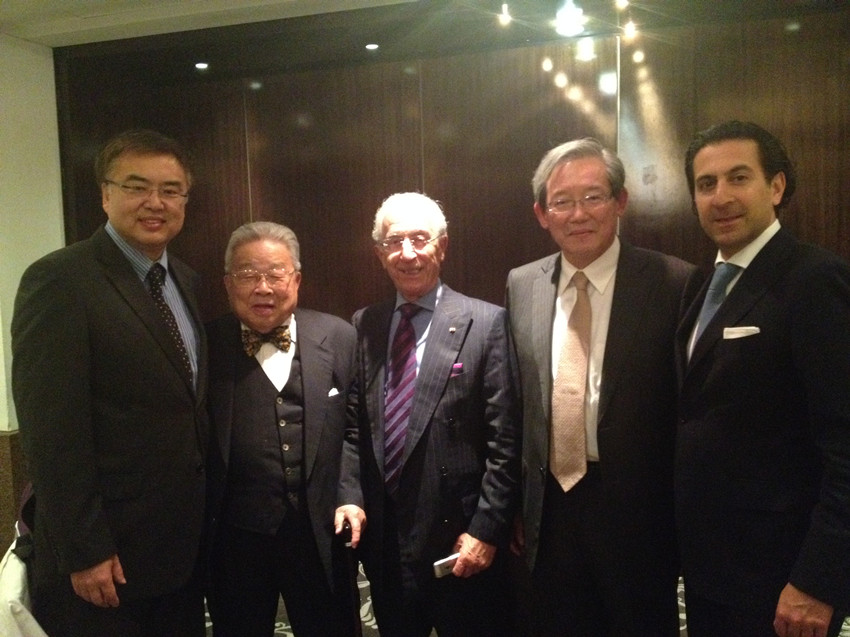 图为北京清华长庚医院王劲副院长(左一)与世界神经外科协会(WFNS)前任主席Dr. Samii(左三)和现任主席杜永光教授(右二)合影