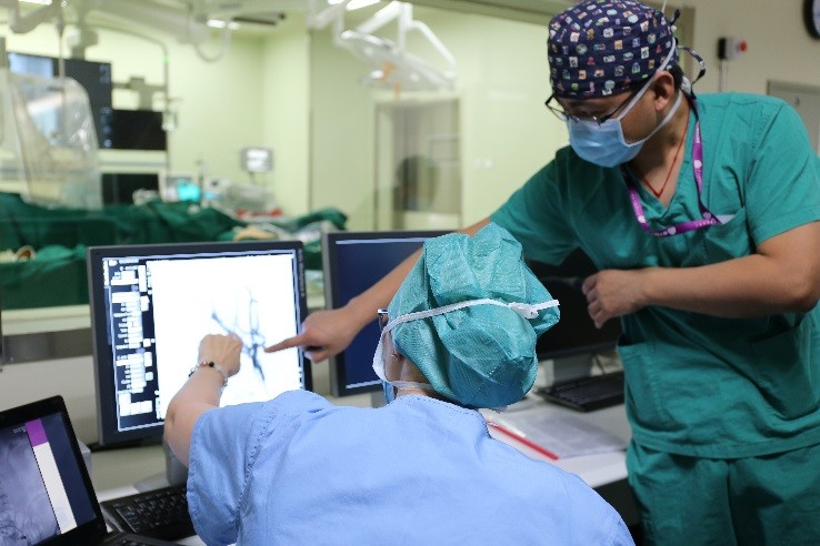 Christine Teichert教授(左)与吴巍巍主任分析术中造影情况