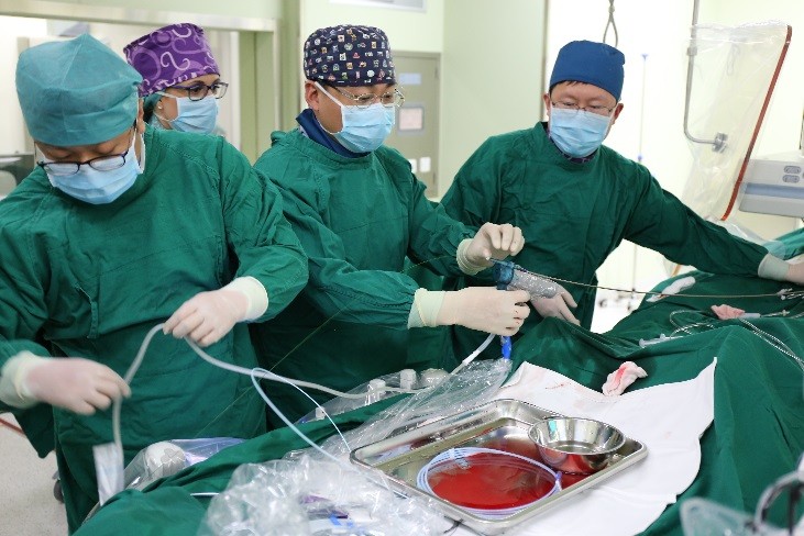 来自德国罗斯托克大学的Christine Teichert教授是静脉血栓领域的专家,在治疗静脉血栓性疾病方面具有非常丰富的经验。Christine Teichert教授与吴巍巍主任、赵克强医师一同分析了患者术中的血管造影结果,并现场指导实施机械取栓术。此手术属于微创介入手术,术中运用机械取栓装置,经皮肤穿刺点进入髂静脉及下腔静脉,将血栓打碎,同时将血栓抽吸出来,避免了血栓碎片脱落引发肺栓塞,具有创伤小、安全、有效等优点。在静脉血栓性疾病的治疗方面,该手术已达到了国际先进水平。