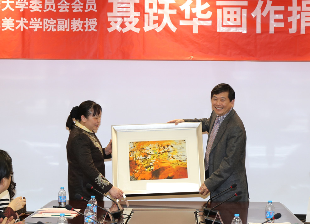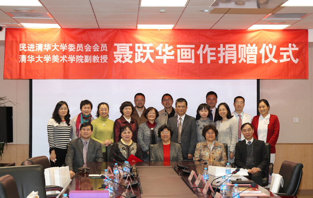 捐赠仪式前,参会的各级领导对此次活动进行致辞。民进清华大学委员会主委杨金龙讲到,作为民进清华大学委员会的会员,聂跃华积极参与活动,用艺术的美影响和感染着身边每一个人,用实际行动诠释了艺术家的魅力。