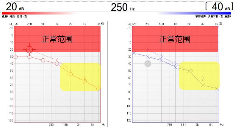 红色曲线为右耳,蓝色为左耳,超出图中正常范围之外,代表着听力出现问题,曲线越向下行,表示听力越差。
