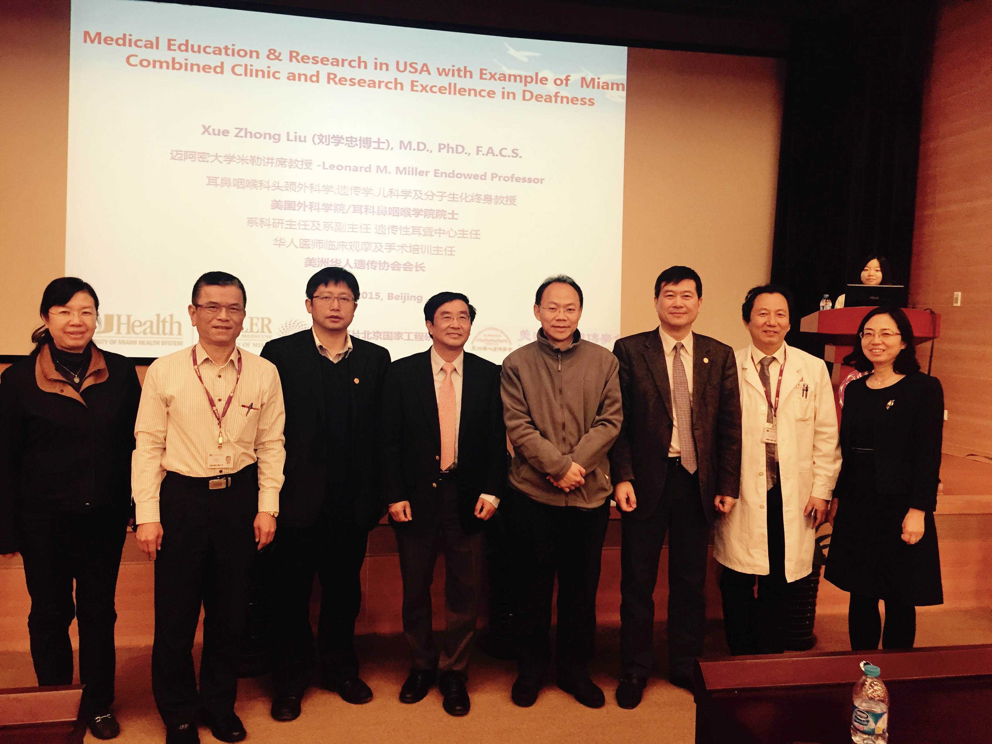 刘学忠现任美国迈阿密大学终身教授和讲席教授、耳鼻咽喉头颈外科系科研主任、遗传性耳聋中心主任。作为全美第一位担任耳鼻咽喉头颈外科系副主任及系科研主任的华人,刘教授结合自身的发展路径,全面介绍了美国医师培训培养体系,并以迈阿密大学的耳科为具体案例,解析了美国医疗服务架构。刘学忠在美建立了国际领先的耳聋分子研究和临床治疗中心,演讲中,他分享了2013到2018年,在基础医学研究上正在或目标进行的科研项目,并以此为启发,介绍了中美在该领域内的合作现状及机遇,提出“共创中美及全球聋病基因的筛查策略”。目前,迈阿密遗传耳聋中心已与生物芯片北京国家工程研究中心建立初步合作,在基础研究与临床治疗两方面开展合作。对此,北京清华长庚医院执行院长董家鸿教授表示,清华长庚医院目标发展基因组学,希望刘教授与程京院士等专家,全面指导清华长庚医院的相关工作,并期望与两家学术研究中心开展合作。