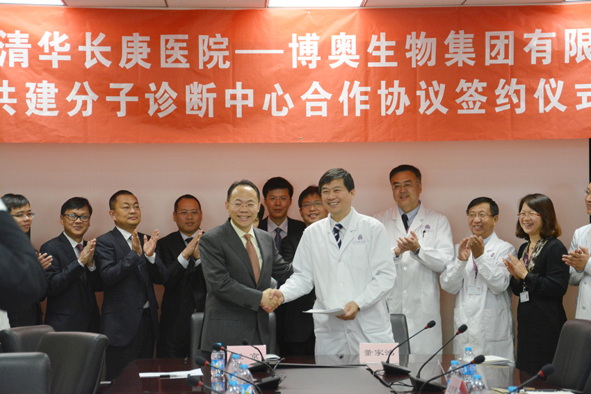 清华长庚医院5月13日电(通讯员 韩冬野)2015年5月13日,北京清华长庚医院执行院长董家鸿与博奥生物集团有限公司总裁程京,于北京清华长庚医院签订两项合作协议。双方共建分子诊断中心,合作开展个体遗传检测服务项目。通过双方的合作;北京清华长庚医院推进精准医学发展,在疾病早期诊断与预防领域迈进一步。
