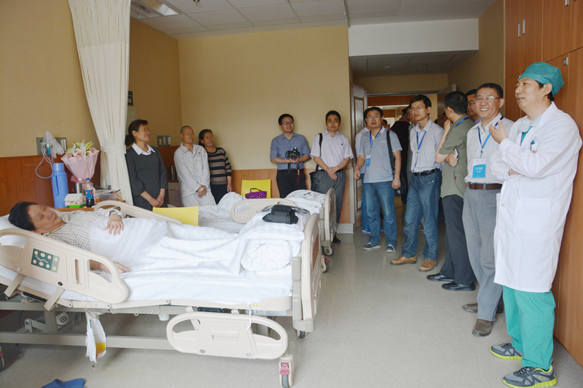 图为北京清华长庚医院神经外科主任王贵怀(右一)带领培训班学员参观病房,与患者进行术前术后沟通(韩冬野/摄)