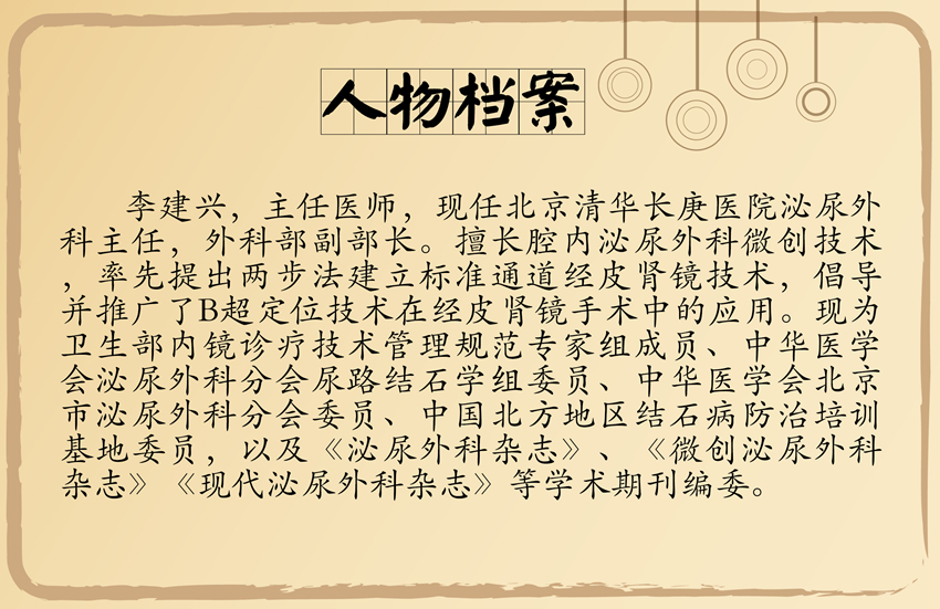B超定位下经皮肾镜技术的开展,让李建兴所在的医院迅速提升至省内的前沿,李建兴也凭借着扎实的临床知识和过硬的技术,而先后获评山东省岗位能手、铁道部外科技术人才等荣誉称号。2004年,李建兴以人才引进方式被调到北京工作,开始了他在京的又一段传奇。