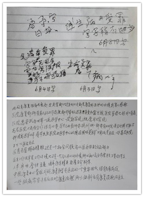 身体状况的好转,还伴随着老人心态上的转变,在练习写字的本子上,6月3日,杜老写下“生病受罪”,因为颤抖,笔划几乎接不上,字迹很是潦草,6月8日重又写下生病受罪,自己感慨着稍有进步,这样“生病受罪”的负面感受一直持续了一个月,24日他开始接受康复治疗,书写的内容也出现了转变,“两周来的康复很有进展,起坐写都比过去好,这都是康复科医护的功绩……”字迹越来越清晰,笔划也恢复了横平竖直,老伴看了心里很是欣慰。
