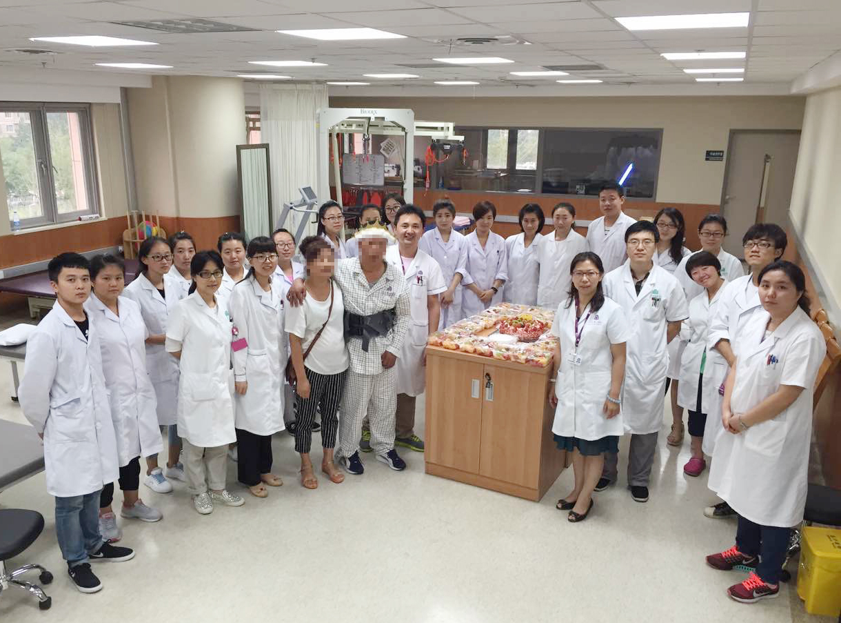 清华长庚医院8月24日电(康复医学科通讯员 马春岳)8月19日,原本是又一个普通而忙碌的工作日,却成了康复医学科特别的一天。下班后,训练室里迎来了一场party,全体的康复医师汇聚于此,欢送一位老朋友——老谷,“恭喜出院啦!”每位康复医师像祝生日快乐一样,祝福老谷。