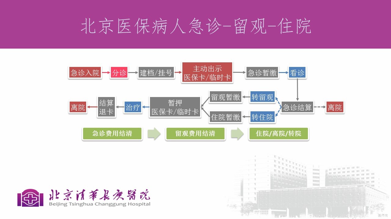2)急诊转留观:结清急诊费用→留观暂缴→办理留观→柜台暂押社保卡或临时卡→留观治疗→结算+退卡→离院