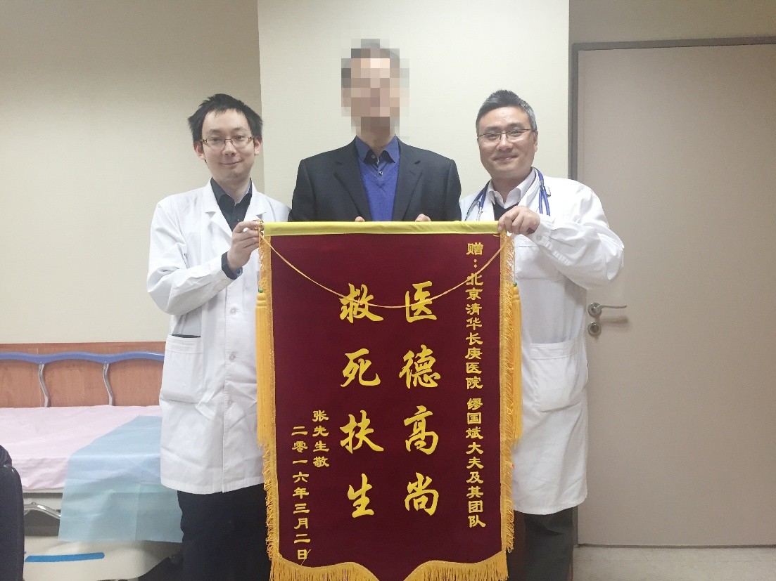 急诊建档、挂号、分诊,直到心内科缪国斌医师急匆匆赶到张先生床前,安排他做术前准备,他才如梦初醒——心肌梗死需要立马做手术。冠状动脉的前降支已接近全部堵塞,“我妻子赶到医院时,接到了病危通知单。”手术成功,张先生于春节前顺利出院了。住院时,他就和妻子商量着给缪国斌大夫送锦旗,可惜临近年关,周边的店面都闭门歇业了。在南方休养一段时间,刚回京没多久,张先生便来到清华长庚,“年前给您送什么,您都不收,今天给您送上锦旗,真心感谢。”