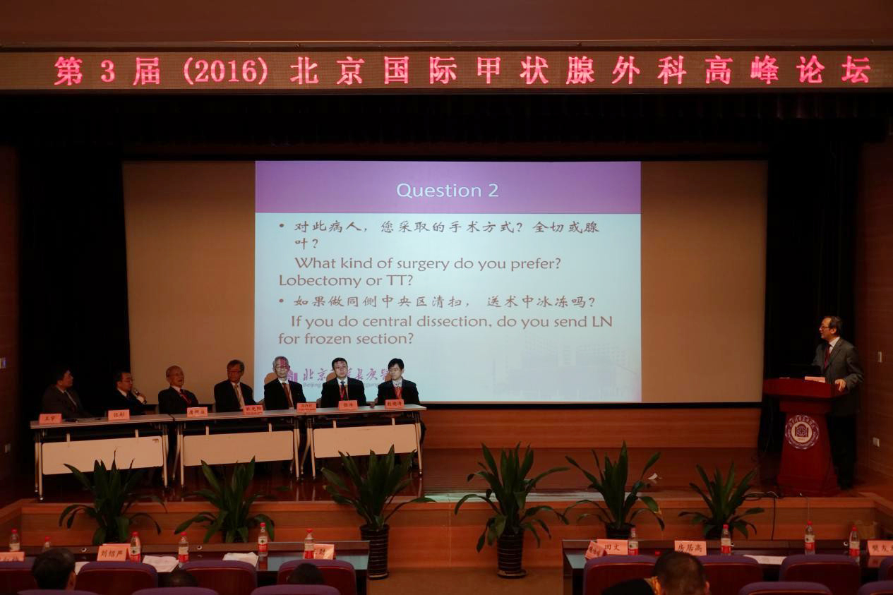 来自日本甲状腺专科医院Kuma医院的院长、亚洲内分泌外科学会主席宫内召教授,发布了最新关于部分低危甲状腺微小乳头状癌长期观察而非即刻手术的数据,他指出大多数的甲状腺微小癌可能都无需手术,这一研究结果已经开始影响到许多国际指南。美国UCSF医学中心内分泌外科主任杜光阳教授介绍了美国内分泌外科医师学会2015版的原发性甲状旁腺机能亢进的诊治指南和2015年国际甲状腺外科领域的热点问题。医科院肿瘤医院头颈外科原主任、我国甲状腺外科的开创者之一屠规益教授结合其50多年的临床经验和文献数据,论述“反对一律用甲状腺全切治疗甲状腺癌”的观点。