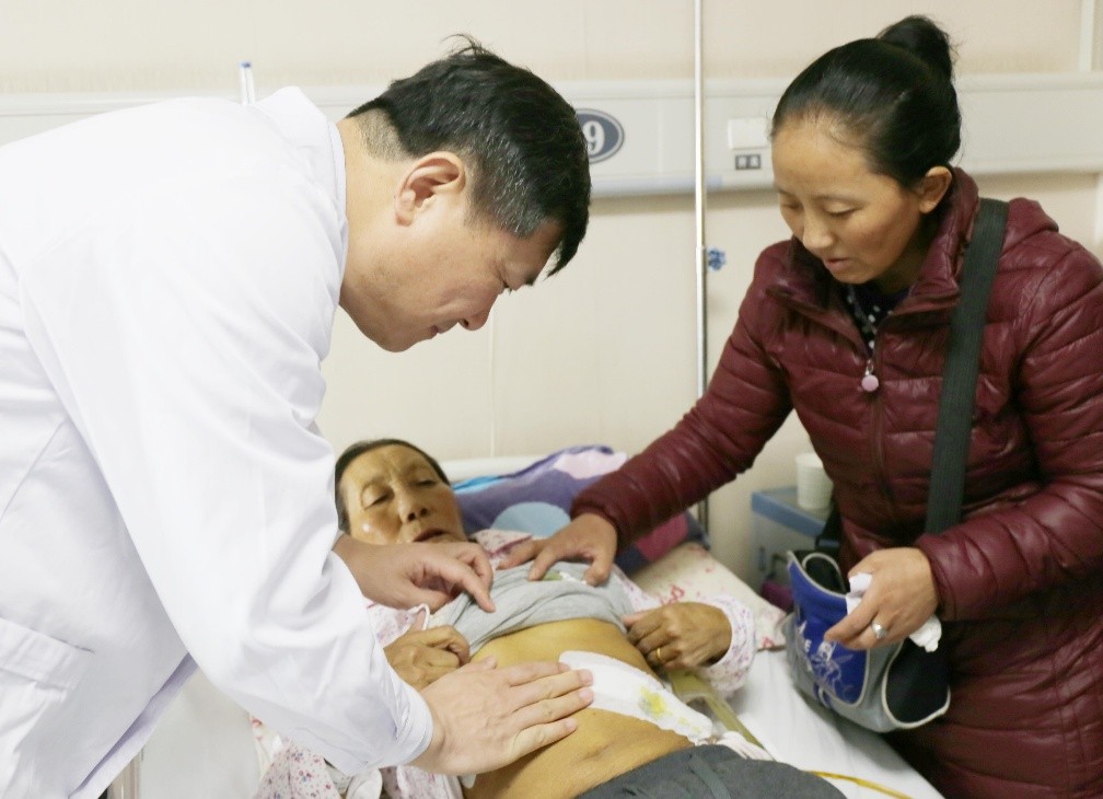 需要会诊的患者多是术后并发症严重,或需再次手术的。为了解病情,董家鸿需查看他们腹部的伤口,细致查体并询问反应;观察引流液性质;一边听管床医师介绍病情,一边查看脉象。每次检查完,他都会留心帮患者重新盖上被子,近两个小时里的20余位患者,无一例外。很多藏族患者和家属与他握手,得知北京专家前来的消息,他们已经等待了很多天。