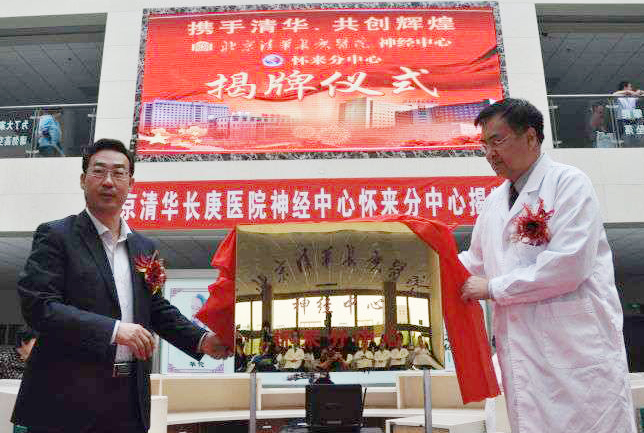 清华长庚医院4月29日电(医政组 张蕾)4月27日,“北京清华长庚医院神经中心怀来分中心”揭牌仪式在怀来县医院举行。怀来县委副书记张志友,北京清华长庚医院(以下简称“清华长庚”)副院长王劲、副总执行长曾亿郎率领专家团队一行15人,怀来县卫计局局长肖振君、副局长刘洪亮,怀来县医院院长姜卫东,副院长、副书记段荣欣到场参加。