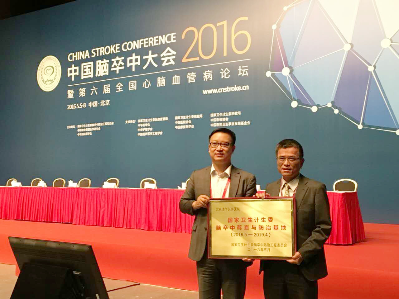 北京清华长庚医院总执行长郭明和与院长助理武剑教授参加国家卫计委卒中筛查与防治基地授牌仪式