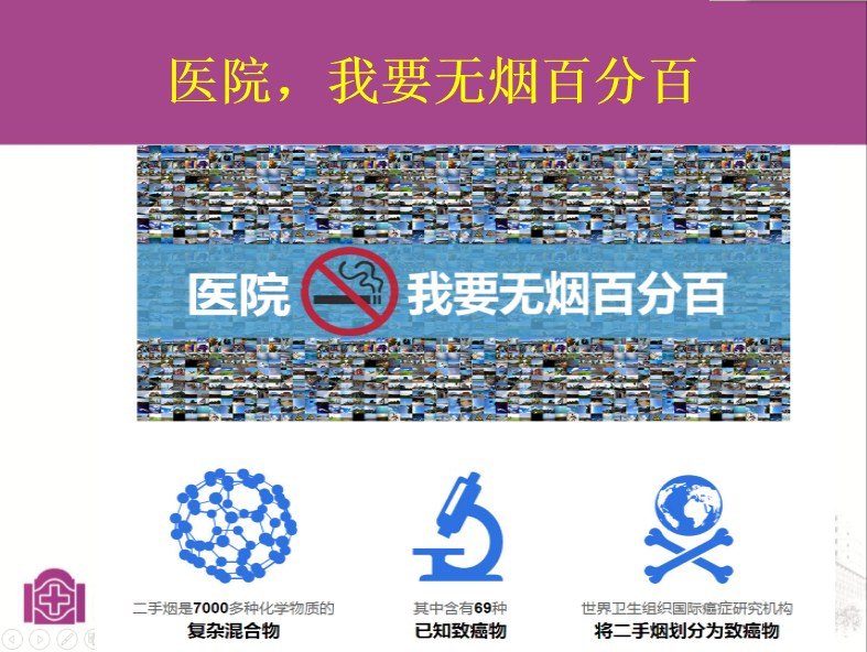 发送控烟宣传资料、放映宣传画,当面介绍吸烟和二手烟的危害,宣导“感谢您,不吸烟”、“请您劝阻身边的人不吸烟,不吸二手烟”,为医务人员与患者拥有一个无烟的环境而积极奔走。