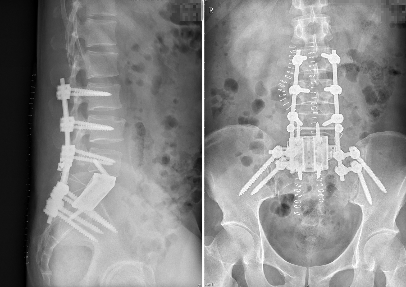 手术在新的一天的凌晨2点结束,术中,跟台护士更换了3批;前后路的转换,患者翻身2次,正常手术历时10余个小时,生命体征未出现波动,患者在ICU病房几小时后即拔管苏醒。术后的患者如厕正常,并已下地活动,复查X光片,内固定位置良好,假体完全贴合。