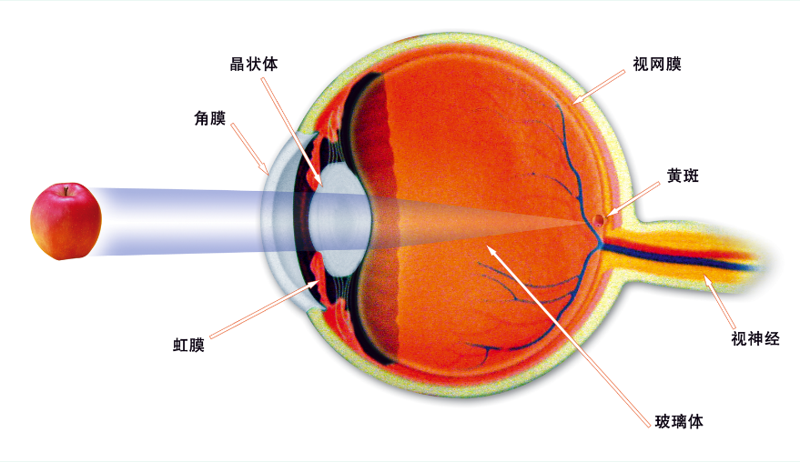 眼是人体最小和最精致的器官。角膜位于眼的前表面,是光线进入眼内的窗口。晶状体位于眼的前段,它的曲率调节有助于使光线聚焦于视网膜。玻璃体是填充在眼球内澄清的胶冻样物质,只有它清澈透明时,外来的光线才能顺利抵达视网膜。视网膜位于眼球壁内侧,布满血管,是具有感光功能的神经组织,它接收光线并将光信号经视神经传入大脑视觉中枢。黄斑位于后极部视网膜,它是视网膜对图像和色觉感知最敏锐的区域,负责中心视力。