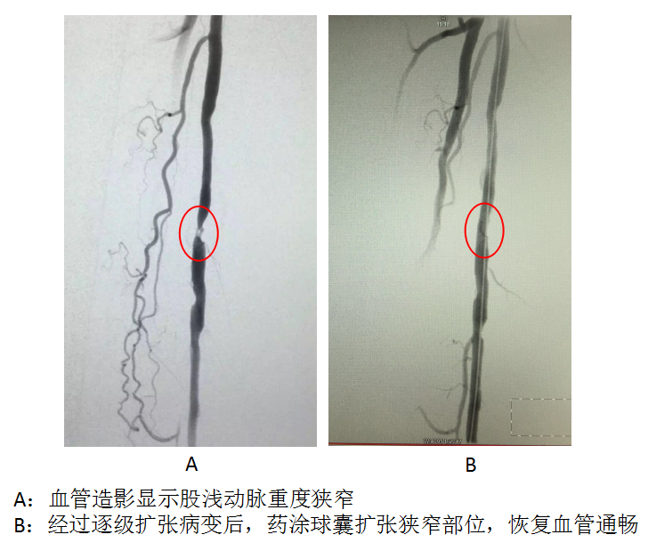 患者刘先生因为“间歇性跛行2年,加重1月”北京清华长庚医院治疗,经诊断,为“下肢动脉硬化性闭塞症”,下肢动脉CT血管成像显示:右侧股浅动脉重度狭窄。术前北京清华长庚医院血管外科吴巍巍主任分析了患者病情,该患者属于短段狭窄闭塞病变,药涂球囊的远期效果更佳。2016年6月16日,吴主任带领清华长庚血管外科团队赵克强、赵俊来、曹战江医师为该患者实施了股浅动脉药涂球囊扩张手术,术后血管造影显示,患者下肢血流恢复,间歇性跛行的症状消失。