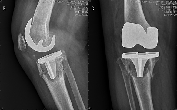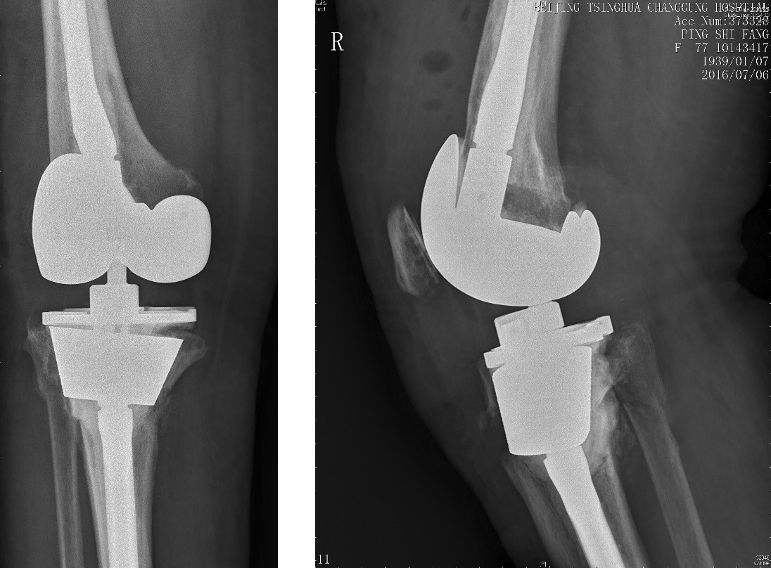患者是一名老年女性华侨,19年前在加拿大行膝关节置换术,术后恢复良好,并无特殊不适。然而就在4个月前不慎摔倒致右侧膝关节肿胀、疼痛,当时并未及时给予特殊诊治,患者仍坚持扶助行器行走,直至患肢负重困难。3个月前再次摔倒,在外院行X线检查提示右侧胫骨假体周围骨折,由于手术难度极大,外院建议保守治疗。因该患者假体完全松动,无法跟骨头愈合,若采用保守治疗将导致行走困难,最终无法行走。