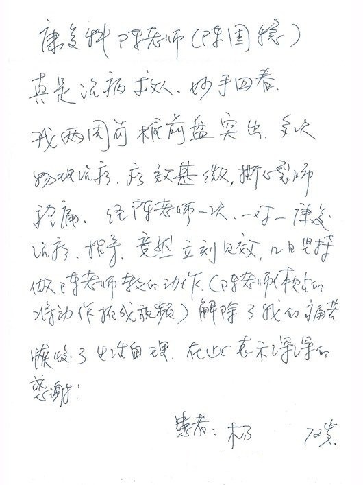 编者按:近日,北京清华长庚医院医患办收到一封感谢信。患者是位72岁的老人,在信中写道“我两周前椎间盘突出,多次物理治疗,疗效甚微,撕心裂肺地痛,经陈老师一次康复治疗指导,竟然立刻见效……”信读至此,您是否也纳闷到底是什么康复治疗?解除了病痛,还让老人家恢复了生活自理?