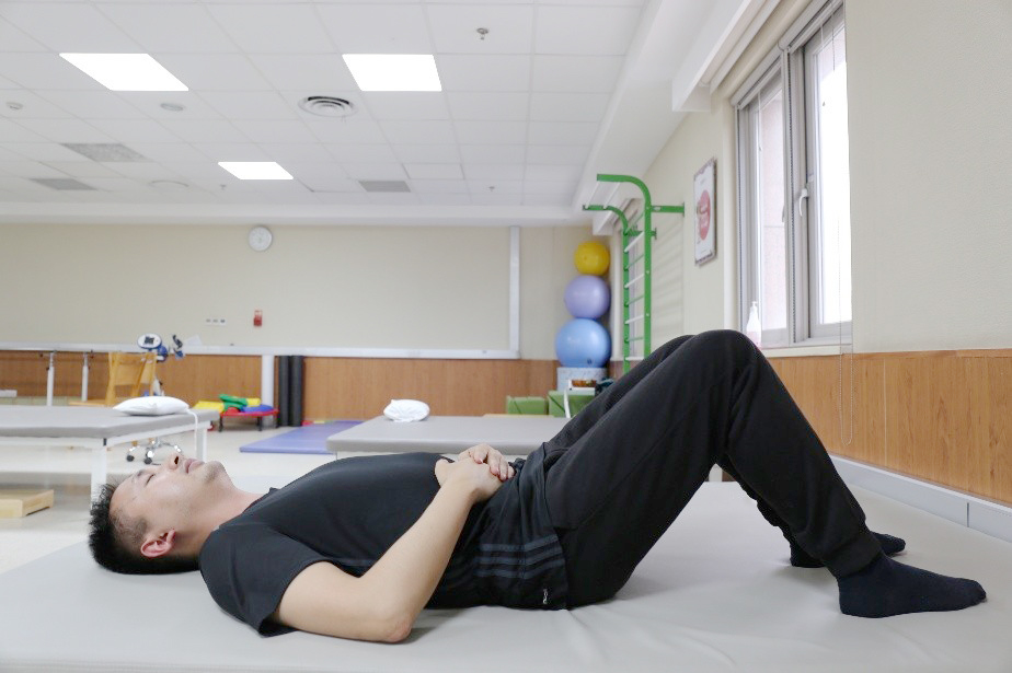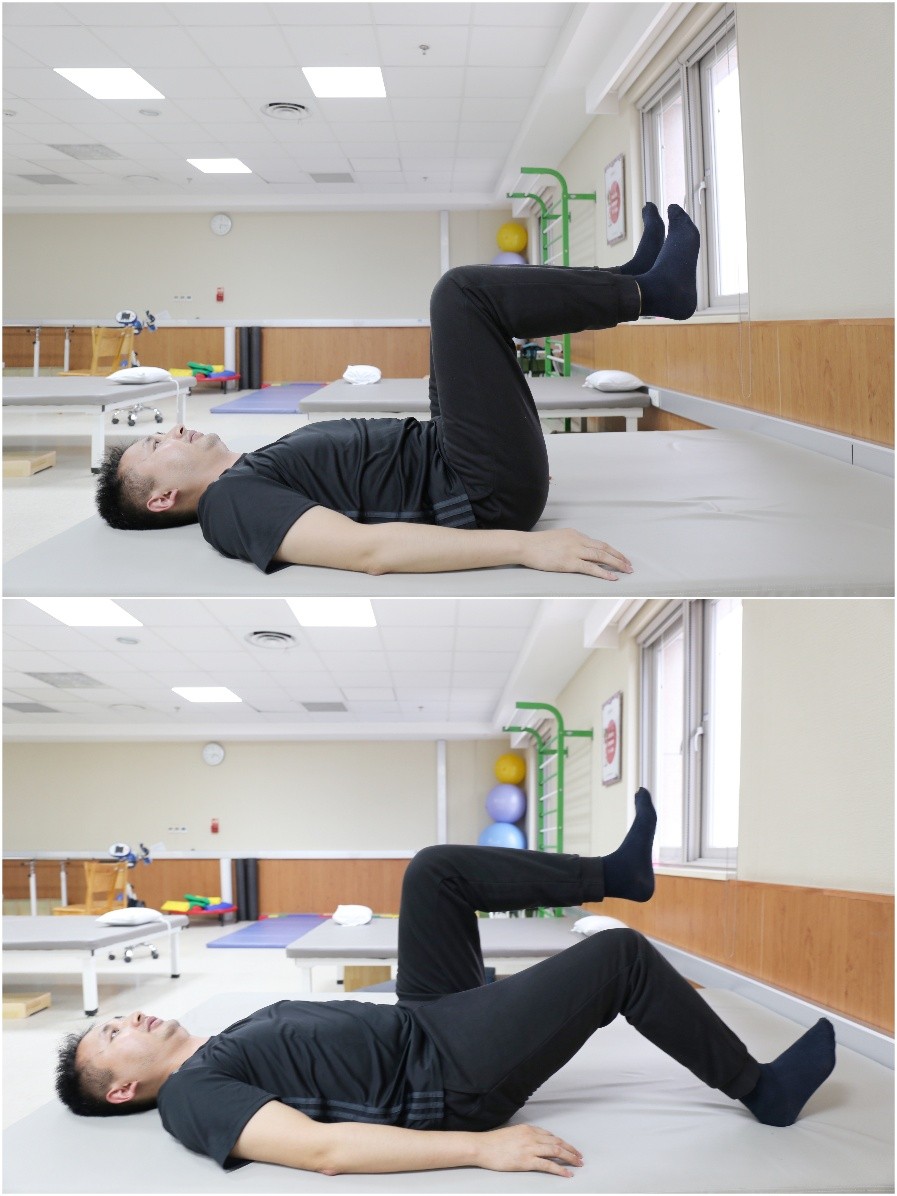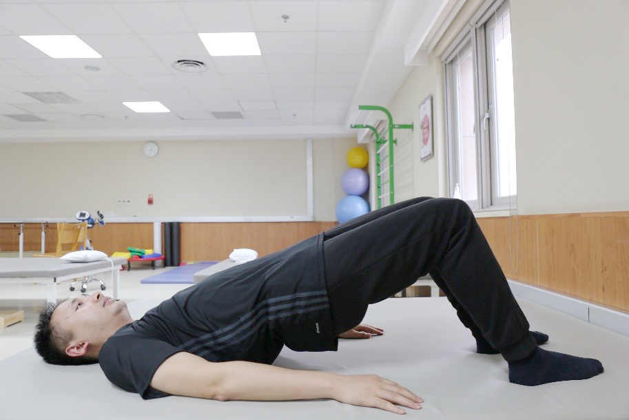 动作一: 双桥运动。仰卧位,双膝屈曲,双脚掌着地。腹肌、臀大肌收缩绷紧,臀部抬起,尽量使躯干与大腿保持在同一直线,保持10秒以上,然后放松回到原位。每天3组,每组10次,每次坚持5秒钟。