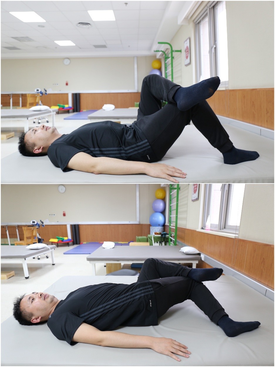 动作三:臀肌牵伸。仰卧位,双膝屈曲,跷二郎腿。上半身保持不动,位于上方的腿向侧方施力,两腿同时向支撑腿的对侧旋转。在此过程中,支撑腿尽量放松,同时配合呼吸,使被牵拉侧尽量拉长。每次保持15秒,每组5—6个,每天3组。