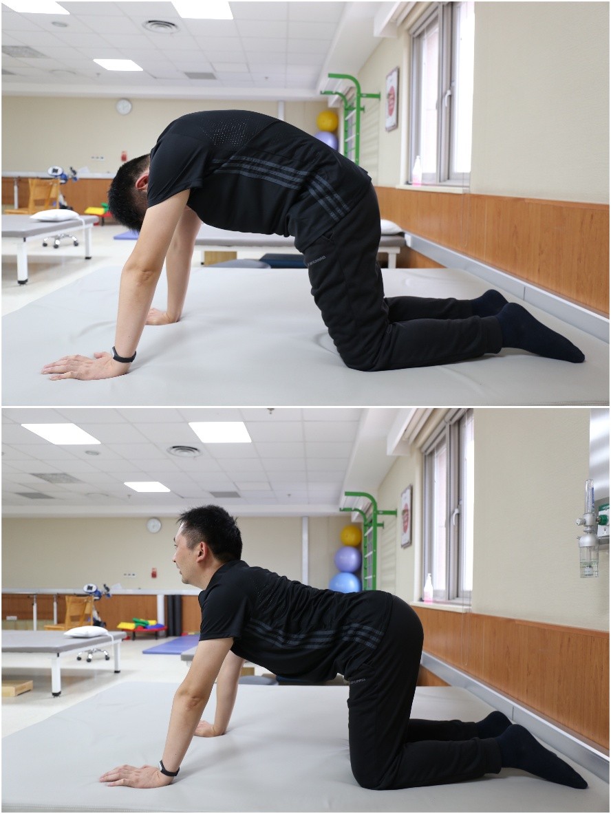 动作六:猫弓背。双手双膝跪位,双上肢、大腿与地面垂直,身体自然放松。吸气,抬头,塌腰,保持5—10秒。呼气,低头,弓背,保持5—10秒。每组5—6次,每日做2—3组。