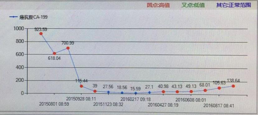 清华长庚医院11月7日电(文宣组实习生 杨洁)一年的时间里,一位胰腺癌晚期患者的肿瘤标志物CA-199值从900多降到接近正常人的水平(37以下),这背后是一个有关信任和坚持的感人故事。