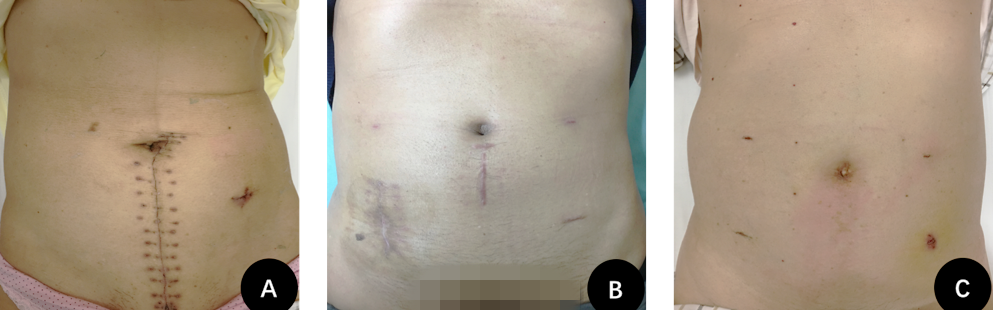 低位直肠癌患者的手术治疗,A为传统的开放手术,下腹部切口长20cm左右,上方需要绕肚脐;B为腹腔镜辅助手术,肚脐下方切口4-6cm长,用于取出病变肠管及消化道吻合;C为北京清华长庚医院普外科开展的“类-NOTES术”,腹部仅有数个穿刺孔,最大直径1cm