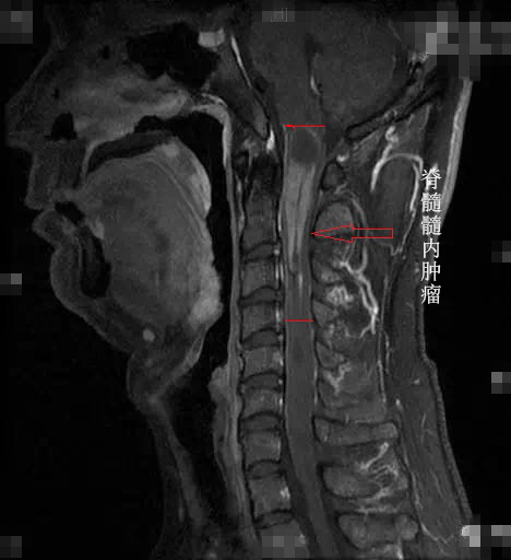 图为患者小智术前的核磁影像,箭头所指为脊髓髓内肿瘤