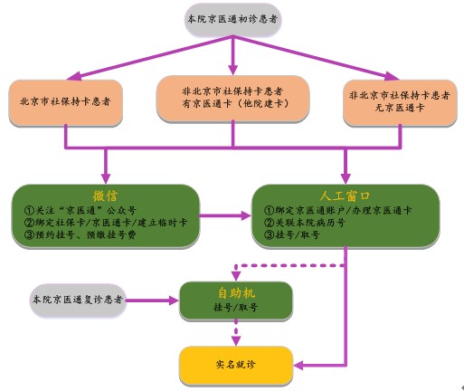 答:目前可通过微信“京医通”平台进行挂号,对于上述三类病患,在挂号前需依据自己的类别进行绑定;患者也可通过院内京医通自助机挂号。
