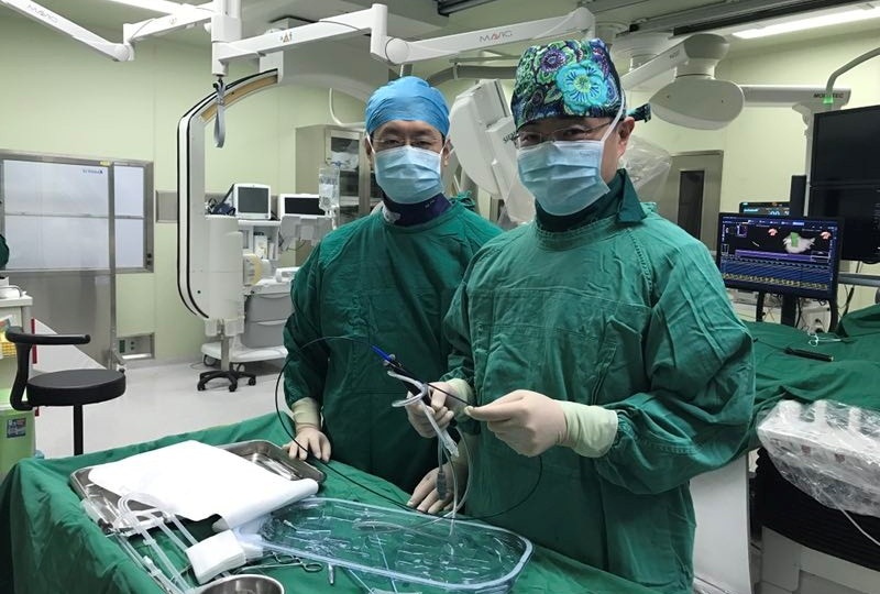图1 刘元伟医师(右)和佘飞医师(左)在房颤消融术中
