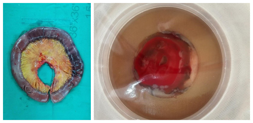 “剩余貌似完好的小肠,在数小时后仍可能再次出现血栓缺血坏死。”李元新指出,如果此时即进行肠管吻合,一旦再次出现肠管坏死,吻合口深藏于腹腔内,无法得到及时有效的观察,导致吻合口瘘将再次给患者带来致命打击。因此,蔺宏伟医师将剩余肠管直接拉出腹腔做临时造瘘,避免了吻合口瘘的风险,并以此为“窗口”观察剩余肠管的血液供应,一旦再次出现缺血坏死,随时实施二次手术。术后三天,局部坏死粘膜脱落后,造口红润,排除了继发血栓的可能性。患者在重症监护病房顺利度过危险期,目前已经可以下床活动,逐步恢复肠内营养。
