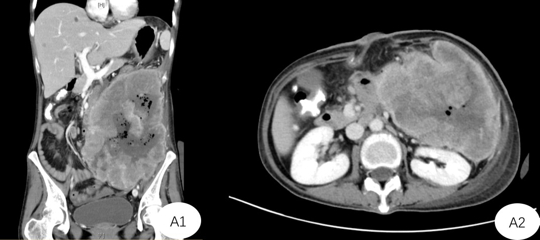 A1+A2:CT提示肿瘤位于左侧腹腔,体积巨大,挤压周边组织、与重要脏器关系不清
