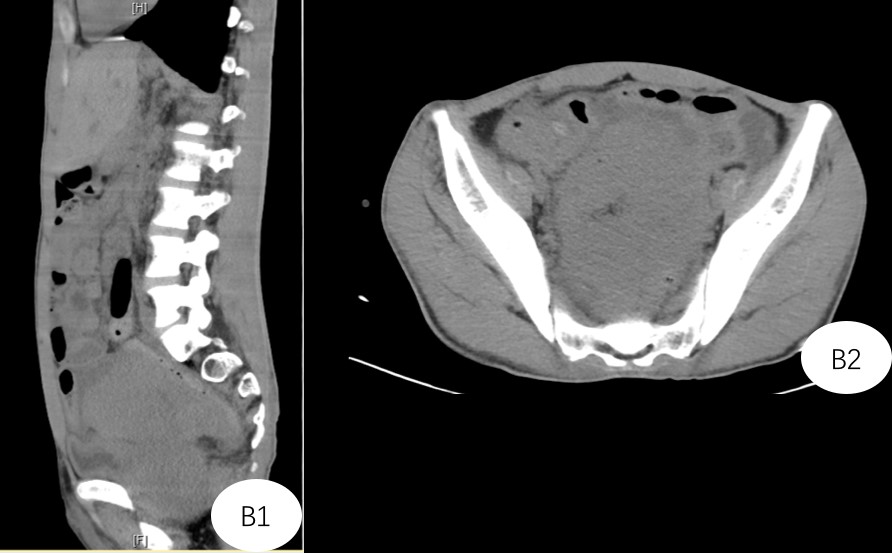 B1+ B2:CT提示患者肿瘤占据盆腔,与直肠、膀胱、前列腺关系不清楚。加上患者骨盆小,术中暴露是手术的难点