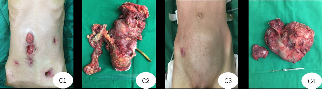 C2:连同结肠造口、肠瘘一并切除。肿瘤体积约30*20cm大小